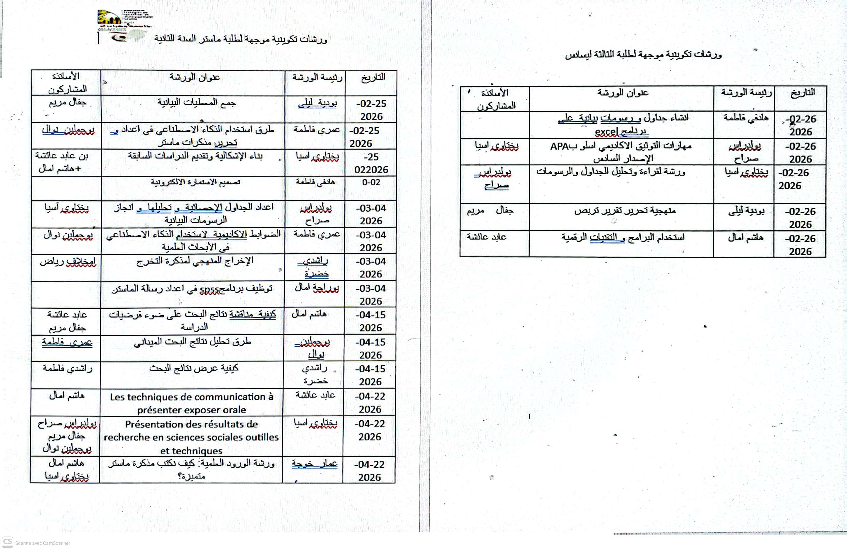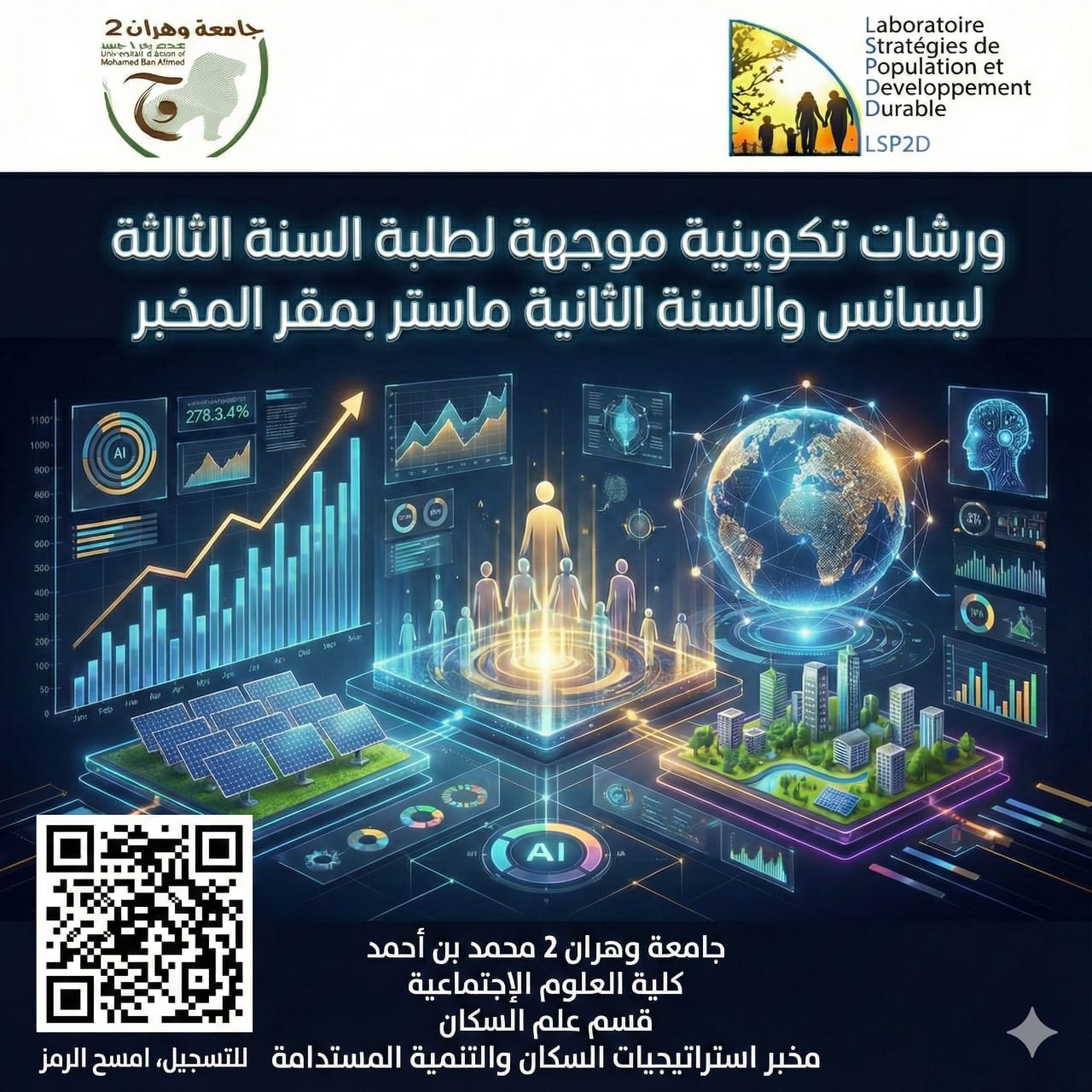 ورشات تكوينية منهجية لفائدة طلبة الديمغرافيا في إطار دعم التكوين الأكاديمي وتعزيز القدرات المنهجية للطلبة، نظّم مخبر استراتيجيات السكان والتنمية المستدامة بالتنسيق مع قسم علم السكان، سلسلة من الورشات التكوينية لفائدة طلبة الليسانس والماستر تخصص ديمغرافيا، وذلك خلال الفترة الممتدة من 25 فيفري الى غاية 22 افريل 2026.. وقد خُصّصت هذه الورشات أساسًا لتأطير الطلبة في الجانب المنهجي لإعداد مذكرات الليسانس ورسائل الماستر، من خلال التطرق إلى مختلف مراحل البحث العلمي، ابتداءً من اختيار الموضوع وصياغة الإشكالية، مرورًا ببناء الإطار النظري والمنهجي، وصولًا إلى تقنيات جمع وتحليل المعطيات وطرق عرض النتائج. وقد عرفت هذه الورشات تفاعلًا إيجابيًا ومشاركة فعّالة من الطلبة، بما يعكس أهميتها في مرافقة الطلبة خلال مسارهم البحثي